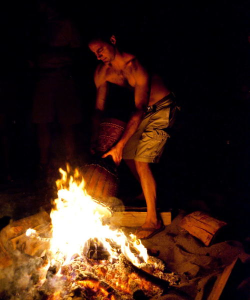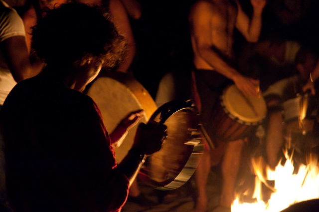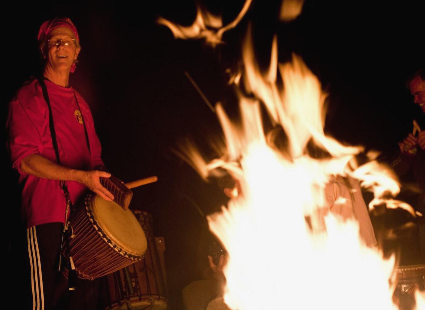 In the photo at left, a man stands over a fire with a drum, while there appears to be a figure of a man's head and shoulders coming out of the ground, with flames above his head forming artwork of a "crown." In the photo at right, a man can be seen running and circling the bonfire and as he runs, flames from the bonfire seem to leap out onto his back and form an image of "angel wings." In the photo at left, there appears to be an image of full standing spirit bearing a "crown" over the head and squirting some liquid at the crowd. Our brains are capable of processing complex rhythms far more easily than previously thought, and while we are unaware. The more we listen to music and complex rhythms, the more efficient the process becomes. At some point, rhythm recognition and processing becomes autonomous (effortless), and it allows one's brain to more freely and efficiently devote effort to important complex and conscious thought. In some instances, the brain can become so "free" that one looses orientation to TIME and SPACE, similar to what occurs in deep meditation. This can and does happen in many drum circles, and dating back more than 2000 years in spiritual and communal ceremonies.