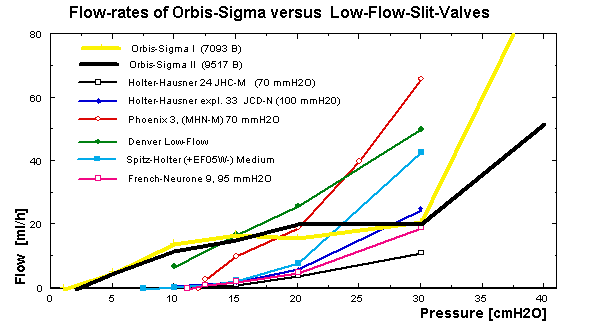 Fig. 13 Comparison of pressure-flow-graphs of Orbis Sigma Valve (type I) vs. low-flow slit-valves with a little bit sticking silicone.
