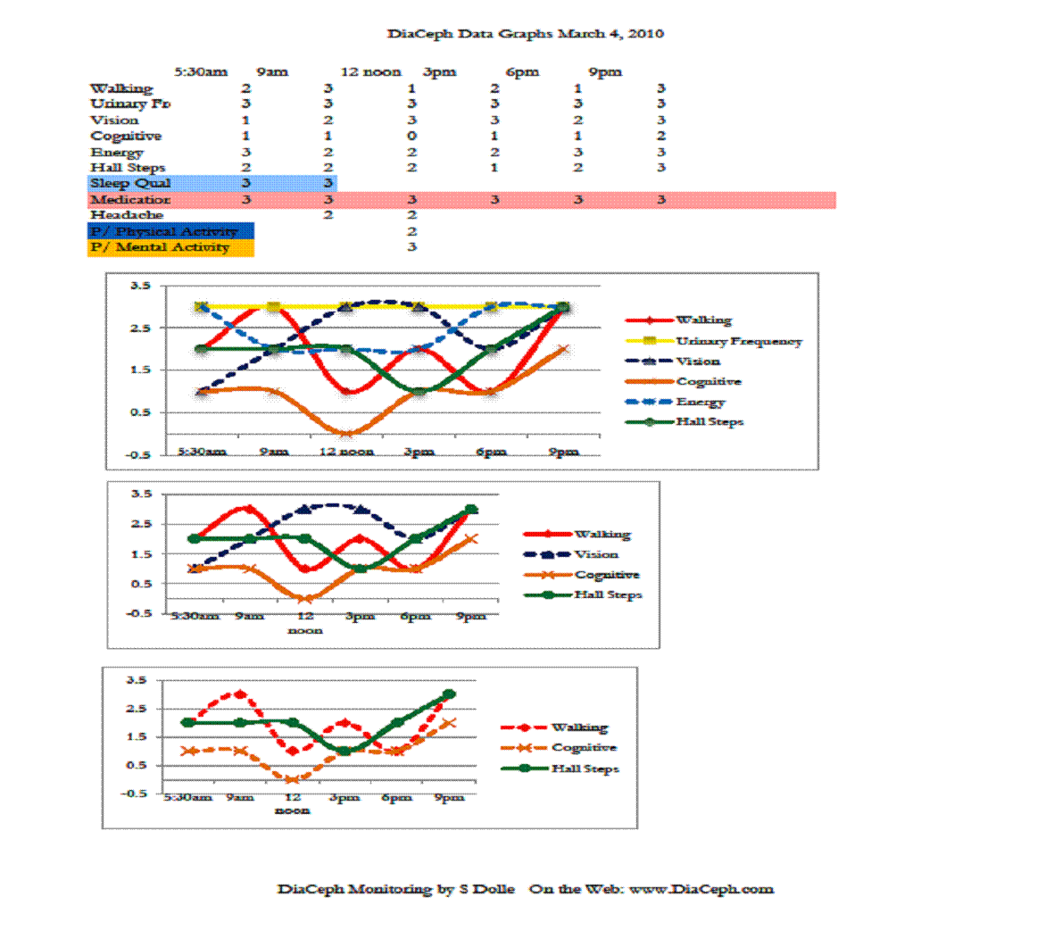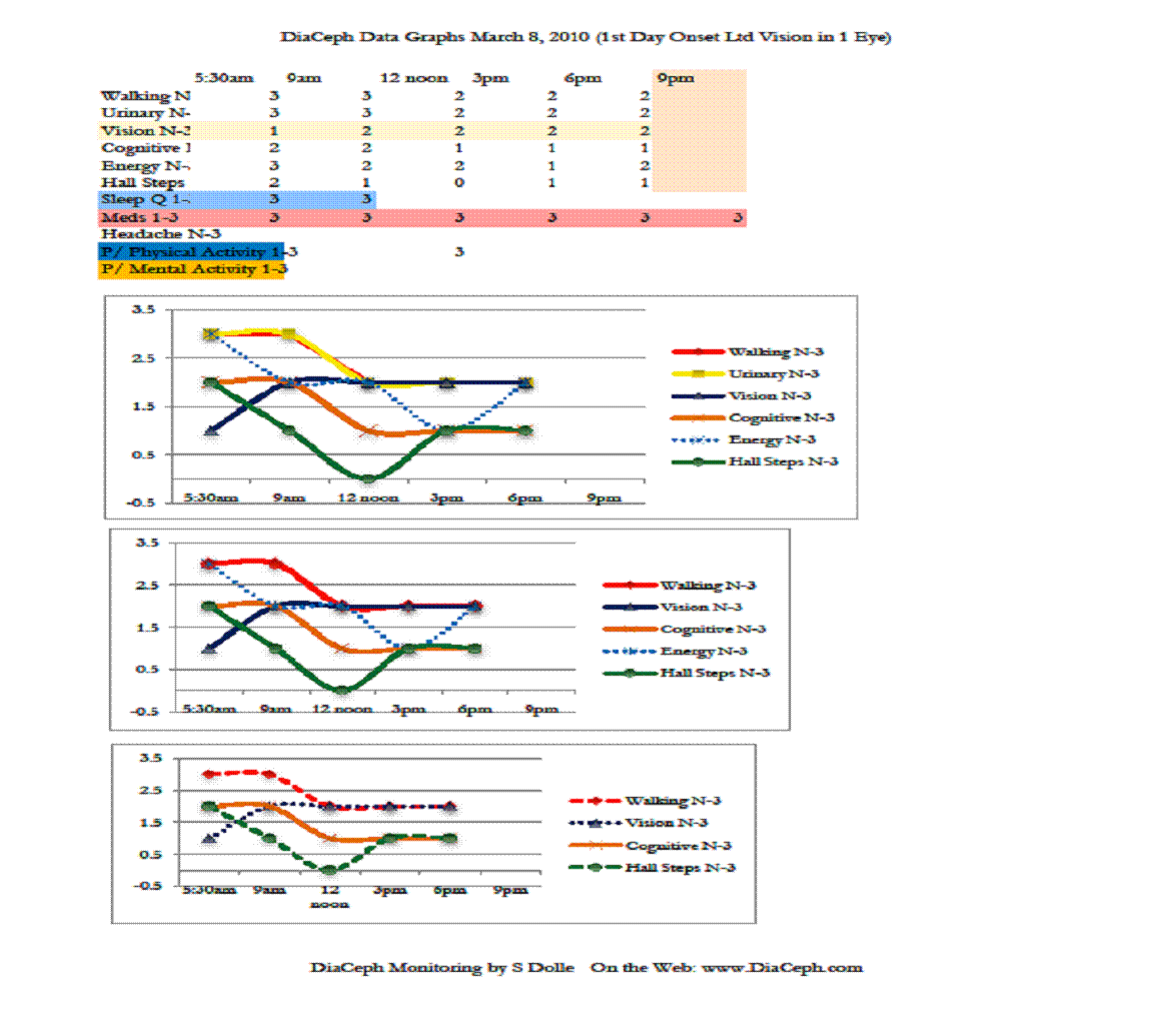 Results and Discussion of DiaCeph Monitoring: DiaCeph monitoring was undertaken with this patient from March 4, 2010 to March 15, 2010. The science behind this DiaCeph monitoring in hydrocephalus is that a patient elicits measurable non-invasive clinical “markers” which reflect shunt or ETV outcome, and severity of hydrocephalus. I review the patient’s history and complaints, identify the best markers, and create a monitoring schedule. Over a two to three week period, the marker data is collected, and then I tabulate and analyze it for ICP levels, shunt function, and shunt matching. Monitoring is usually done 5-6 times per day, for 14 to 21 days in succession. Each monitoring day produces a graph of each of the markers. Monitoring for 14-21 days assures there will be enough data points to produce an accurate distribution of the patient’s complaints. In many cases, additional event or activity monitoring is required.