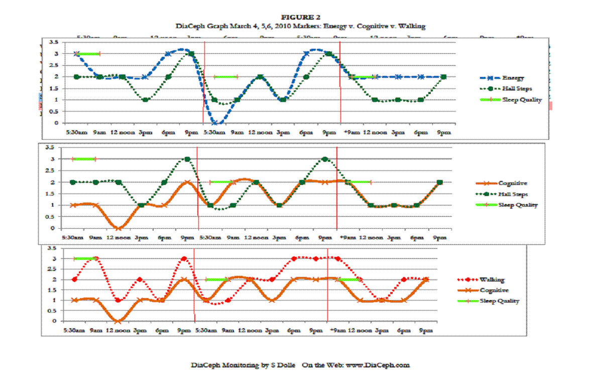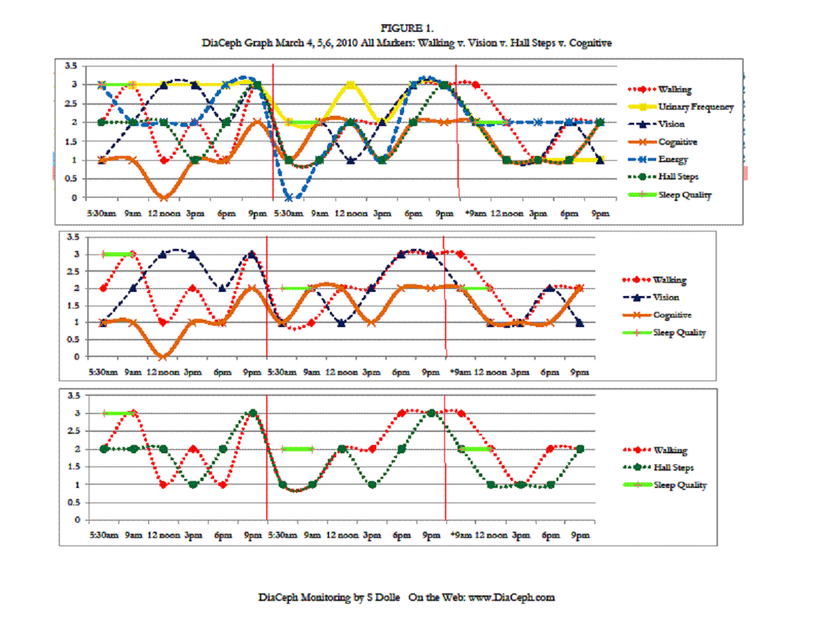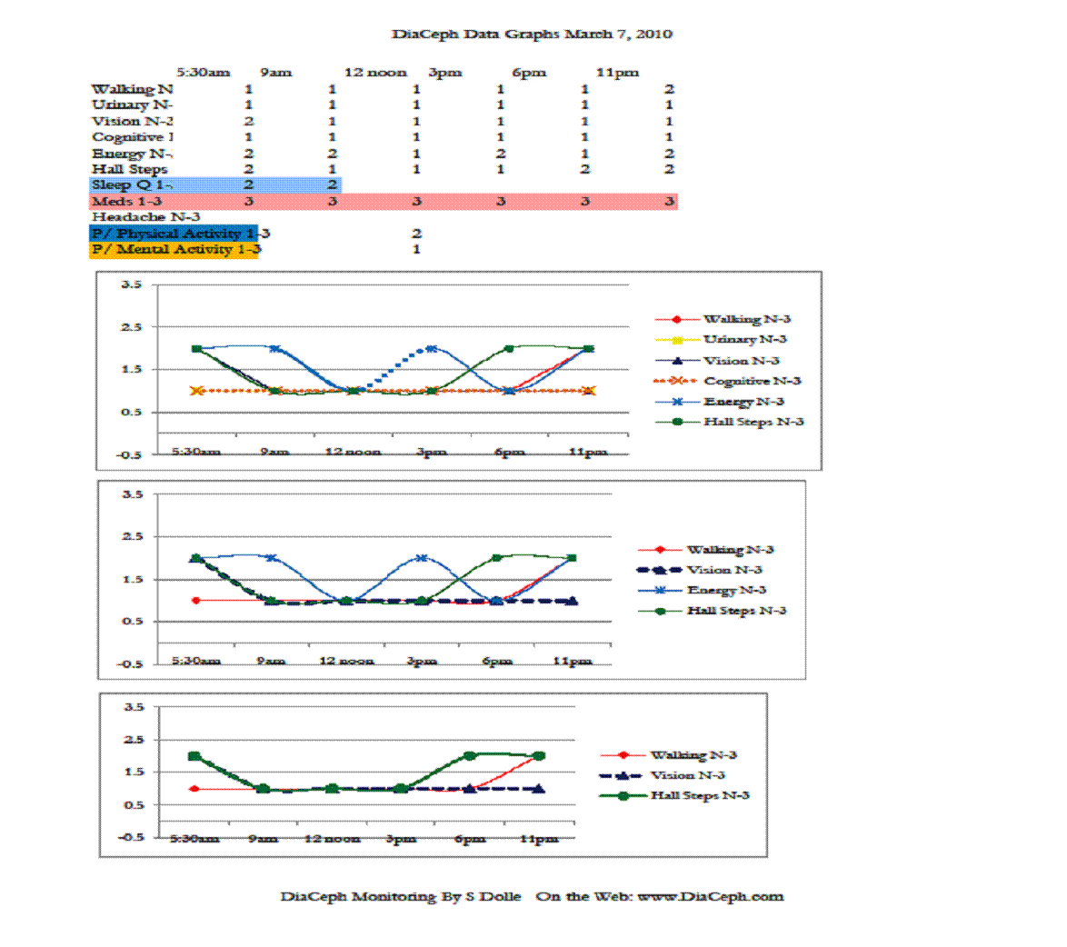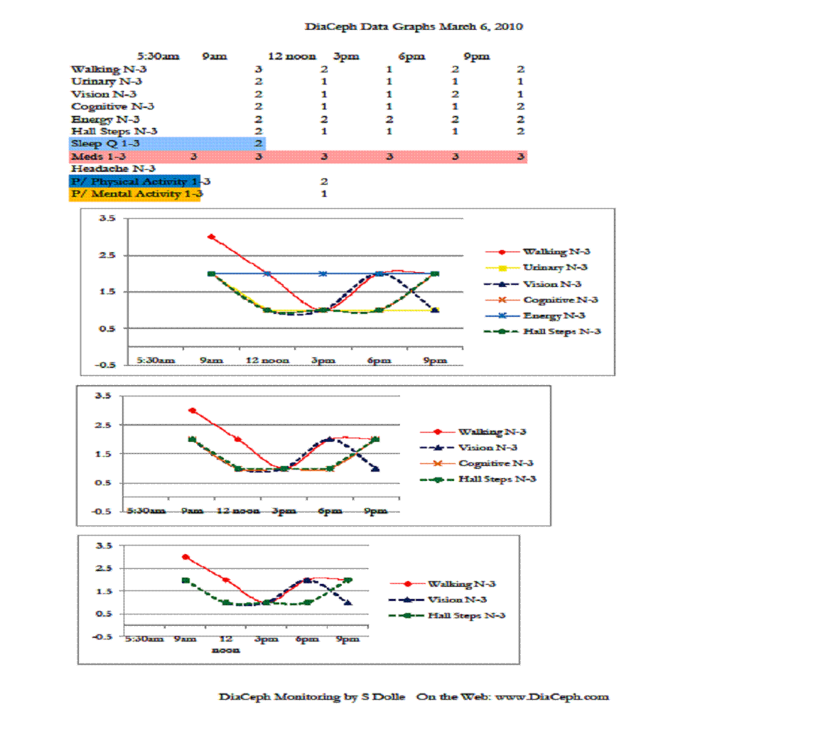 Of his markers, perhaps the most telling is how well his Cognitive curve fits to his Walking and Hall Steps curves, and how they rise and worsen in the evening. The rise and fall of his Cognitive curve also mirrors his Walking and Hall Steps curves, which is consistent with NPH. However, the fluctuations in his Cognitive curves are less dramatic. This would be due to either test methodology, or that his cognitive changes are unrelated to NPH. His surgeon noted in his admission record of 11/30/09 that he was complaining of heaviness in his legs more in the evening, but that it had improved during the daytime. This would seem CSF outflow and NPH related, likely “inadequate” CSF clearance. His neurologist also noted an “orthostatic intolerance,” which may well be the loopyness he is reporting. His ongoing heaviness in his legs is likely the elevated Walking and Hall Steps DiaCeph data seen later in the day and evening. We need additional monitoring to identify his “loopyness” in the data.